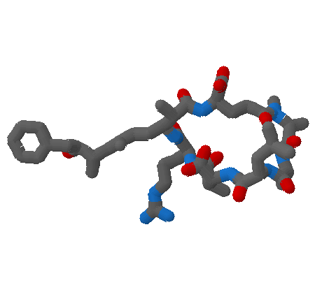 Note the blue atoms (Nitrogen) at the peptide bonds and in the guanidyl group of arginine. The red denotes oxygen atoms and carbon atoms are marked grey. Hydrogen atoms are not indicated. The relative hydrophobicity of the Adda moiety is depicted here, as is the potential binding capacity of the central core for metal ions. The amino acid methyldehydroalanine forms a covalent bond with a cys residue of protein phosphatases (PPases) in disrupting PPase activity, causing toxicity.
