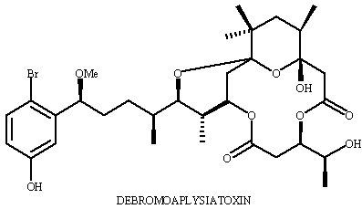 Produced by marine cyanobacteria such as Lyngbya, aplysiatoxins are commonly known for their dermatotoxic activity causing inflamation of the skin. They are also potent tumour promoters. Aplysiatoxins and debromoaplysiatoxin have been found associated with filamentous cyanobacterial species including Schizothrix calcicola and Oscillatoria nigroviridis.